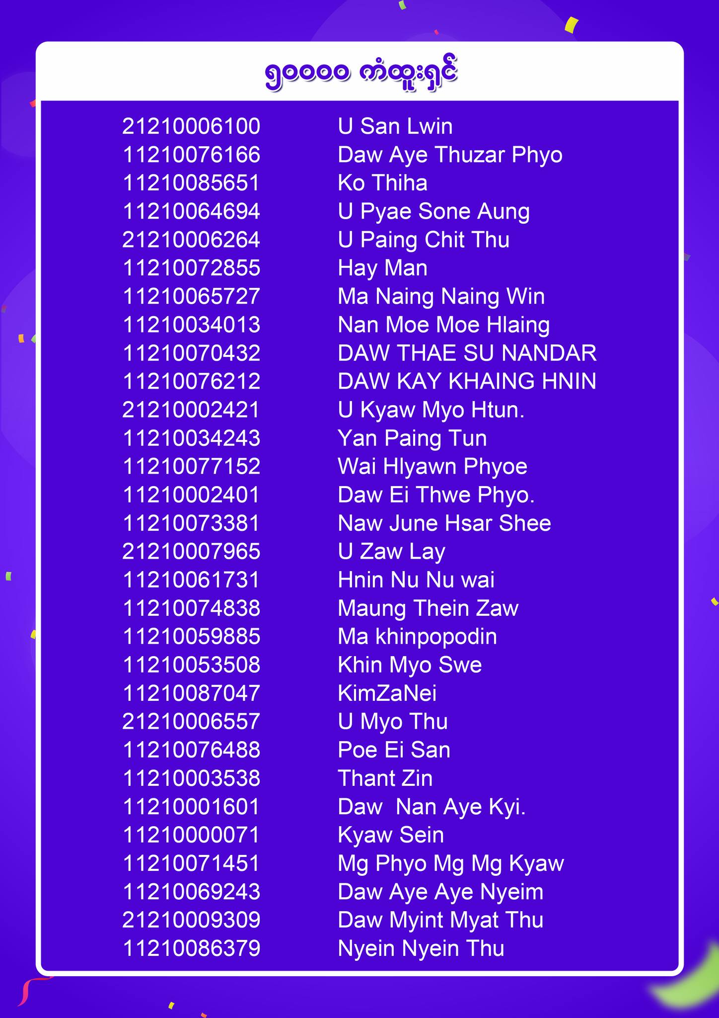 .TRUSTY ရဲ့ ယုံကြည်မှုတိုင်းအတွက် ဆုလာဘ် live ကို မကြည့်လိုက်ရတဲ့သူတွေအတွက် Lucky Draw winner တွေရဲ့ List ကို ထပ်မံကြေညာပေးလိုက်ပါတယ်။